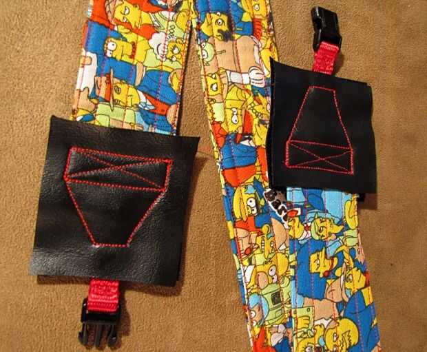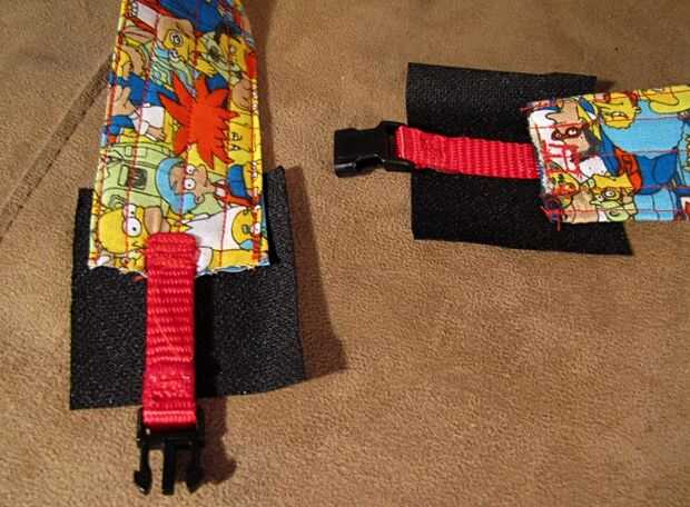 Poner un cuadrado en cada lado de la correa, haciendo un sándwich. Puede tratar de pin que ellos juntos, pero encontré que se deslizaron mucho, y fue más fácil hasta y presionado con el pie de la máquina de coser. Una vez más, se puede utilizar hilo de juego o contraste. Coser en cualquier patrón de te como, mientras se refuerza y coser alrededor de los bordes. Me gusta tiene forma cónica al extremo con la cinta y la hebilla, como esto le da un aspecto más profesional.