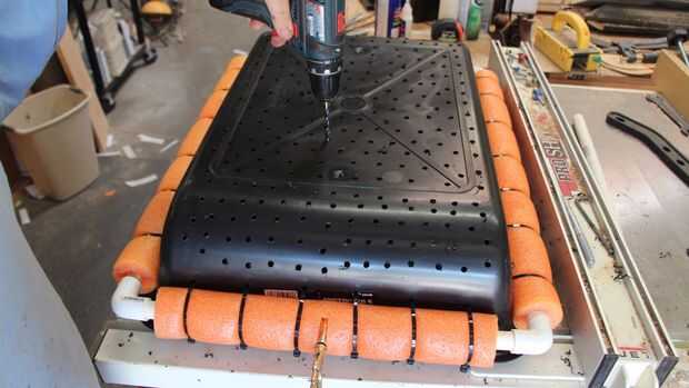 Paso final es crear el fondo del tamiz. Taladré cientos de agujeros, he intentado que se vea organizado pero conseguir desordenado en puntos, subió en los extremos redondeados para ayudar con el drenaje al salir del agua.