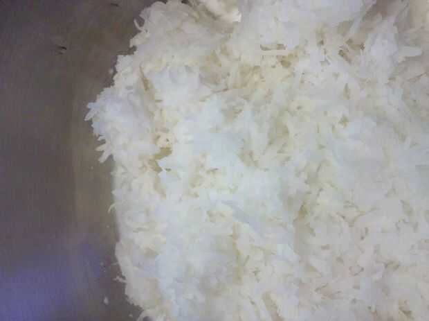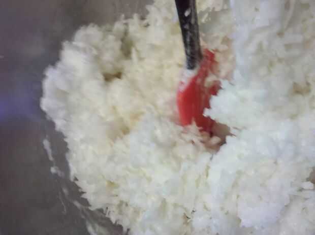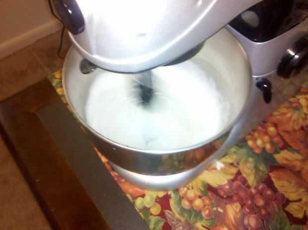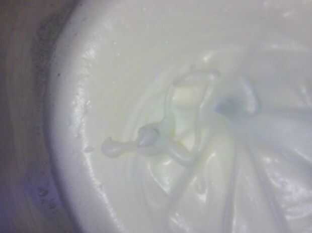 3) cuando las claras han comenzado a picos de forma, dejar de mezclar. Debe tener un merengue como textura.