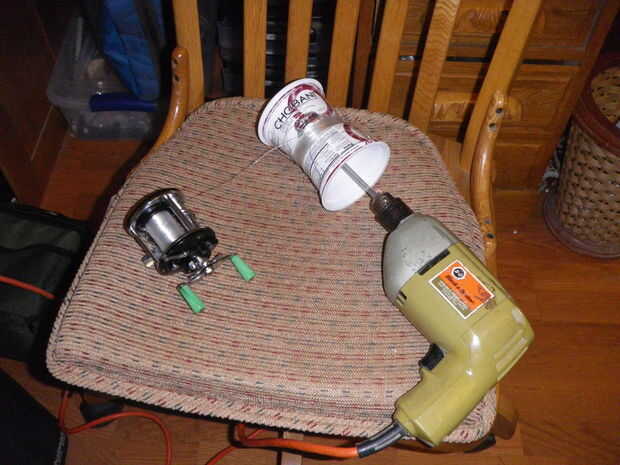 La línea puede ser arrojó en cualquier taladro eléctrico y ser utilizado para rápidamente quitar la línea de un carrete. Cuña al final de la línea entre los envases de dos yogur, encienda el taladro y quitar tanta línea que necesita de su carrete de pesca. Cuando hayas terminado, sólo Desenroscar la tuerca de mariposa. Esto permite separar los envases y la masa de la línea que ha sido herida allí puede que se puede quitar fácilmente