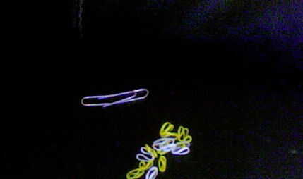 Paso 1: materiales You need :-bandas de caucho-S o C clip-horquilla-lápiz (opcional)Estoy usando púrpura y verdePaso 2: Primer paso Gancho agarrador de la horquilla y su primera banda de goma (el mío es morado) deslícelo a través de la primera cerda,