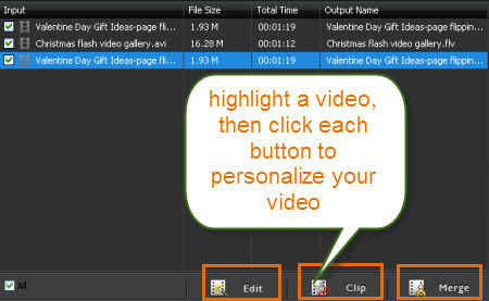 video a FLV experto no sólo soporta convertir video de cualquier formato a FLV, pero también posee función de edición de vídeo. Simplemente haga clic en editar, botón Clip y combinación, puede Agregar texto e imagen de marca de agua para mostrar su logotipo de la marca o derecho de autor, piezas imperfectas del clip, o combinan videos en uno solo.