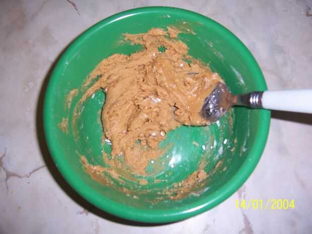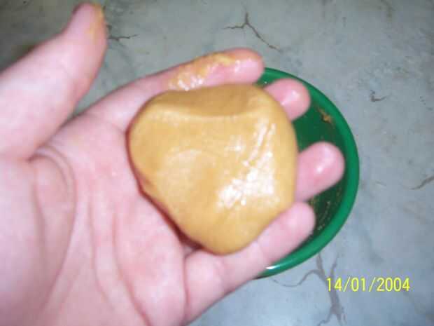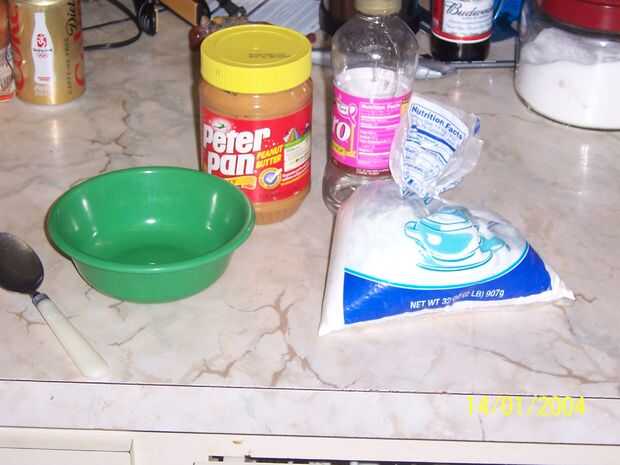 para mi tamaño utilicé 2 cucharadas de cada cosa y mezclados todos juntos, el azúcar en polvo espesa la penut mantequilla y jarabe de maíz a una masa como masa para galletas. La única diferencia es la pasta de la galleta se hornea en una cookie esto sólo haría una guerra blanda mess! Así que comed que esto crudo y no enfermo por un tiempo a menos que el moho comienza a crecer.