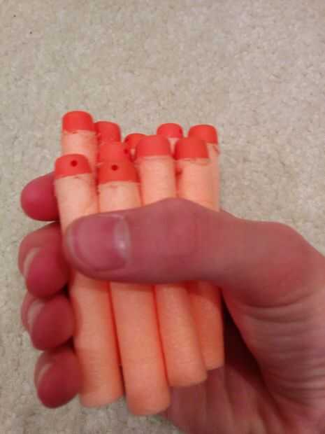 Media los dardos/stefans de agarrar y sostener en una mano, todos la misma dirección. La pulsera broche de presión con la misma mano del gancho agarrador, y luego el resto de los dardos en la parte superior de la pila. Una vez tengas todo esto agarró con una mano, la otra utilice para envolver la cinta de goma alrededor de la parte superior de los dardos. Hecho! Nota: Si usted empuja las puntas de los dardos en el centro abajo menor que aquellos en el exterior, es altamente más propensos a explotar