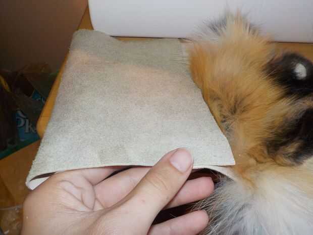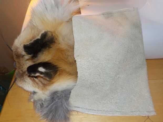 Para comenzar a coser el cuero en una bolsa, doblar por lo que serán sus costuras en el en. Deje 3/4 espacio detrás de la cara de fox para que la tapa frontal puede abrir y cerrar una vez terminada la bolsa es más fácil.