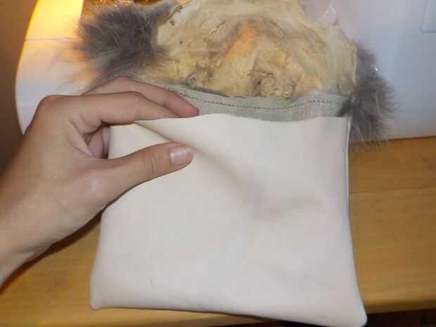 El resultado final cuando haya terminado la costura parecerá un bolso "al revés", con cabeza de zorro en la dirección equivocada. No te asustes, porque una vez que lo giras hacia el lado derecho hacia fuera (como se muestra en el cuadro 4), será correcto!