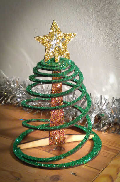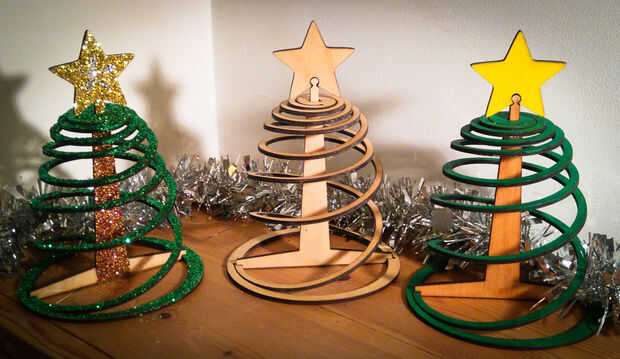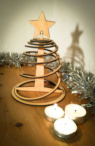 La flexibilidad de la madera contrachapada de corte depende de las longitudes de los elementos siendo doblados. Una espiral da un elemento largo que se puede estirar más allá de su diámetro (pruebas empíricas solamente!) Usando sólo un espiral crea un árbol de aspecto agradable pero las fuerzas que actúan sobre la madera no están equilibradas por lo que inclina. Este diseño tiene dos espirales que comience y termine enfrente de la otra por lo que sus fuerzas equilibran y dan un árbol recto.