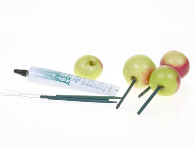 Para asegurar las manzanas u otra fruta de su elección en las ollas de barro, sólo Inserte una selección de 4" de madera en la base de la manzana y fijarla con una pequeña cantidad de adhesivo Floral Oasis. Este pegamento es verdaderamente impresionante. Enlazará sus velas a la espuma húmeda, plástico a plástico y madera de la fruta. Consideramos la floristería de equivalente a cinta.