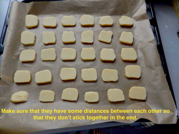 Colocar el papel de cocina encima de la bandeja del horno y poner las masas en líneas. Debe haber algunos espacios entre ellas para que cuando expanda un poco en el horno, no se peguen entre sí.