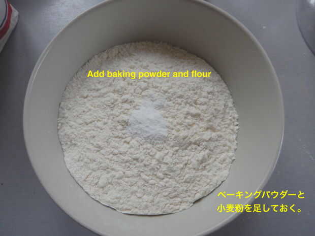 小麦粉とベーキングパウダーを合わせたものを3回くらいに分けて足し、混ぜます。 次の三分の一を入れる前に、その前に入れたものがきちんと混ざっているようにしてください。