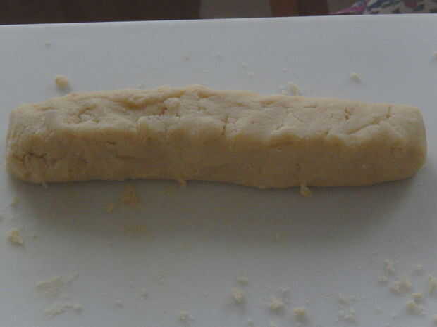 できた生地をフードプロセッサーから取り出して、直径5センチくらいの筒を作ってください。 円柱でも四角柱でもなんでもいいですが、表面がある程度スムーズになるようにしてください。