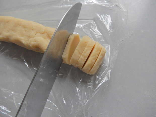 Sacar del refrigerador después de 30 minutos y cortarlo para que el grueso de cada rebanada es aproximadamente de 8mm. Cuando lo hace, encienda el horno y poner a 170°.