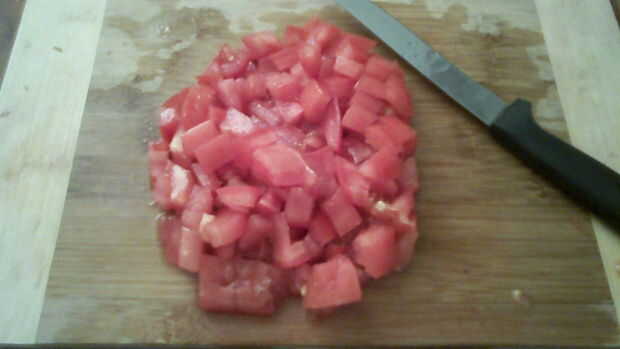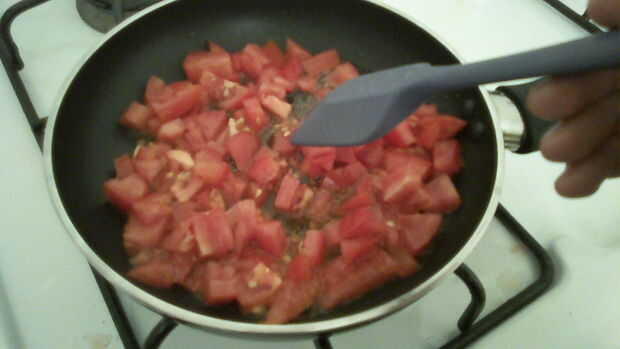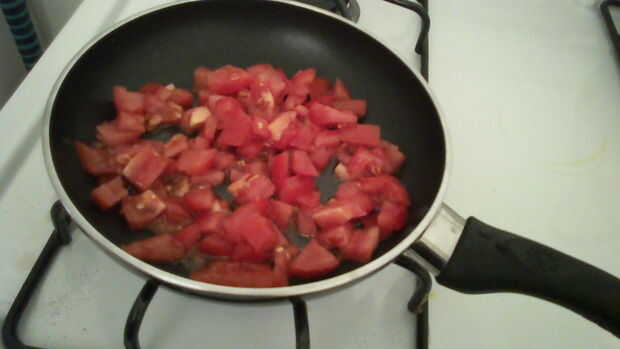 Lavar y picar un medio tamaño tomate en pedacitos pequeños. Deseche la parte media del tomate. Poner una cucharada de aceite en una sartén a fuego medio y añadir la derecha tomates picados después. Agregue los tomates hasta que esté cocido, pero no a fofo (depende de cuánto quieres cocinado).