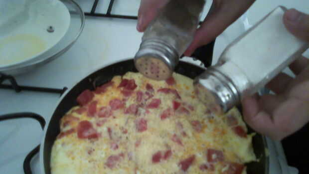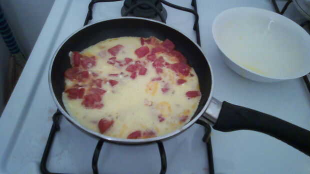 Añadir la mezcla de huevo con los tomates cocidos. Remover un poco y poner una tapa de pan sobre ella. Poner el calor en baja y deje que se cocine hasta que parece. (De había demasiado los huevos!). Agregue sal y pimienta. Poner en un plato y servir con pan de pita. ¡ Disfrute!