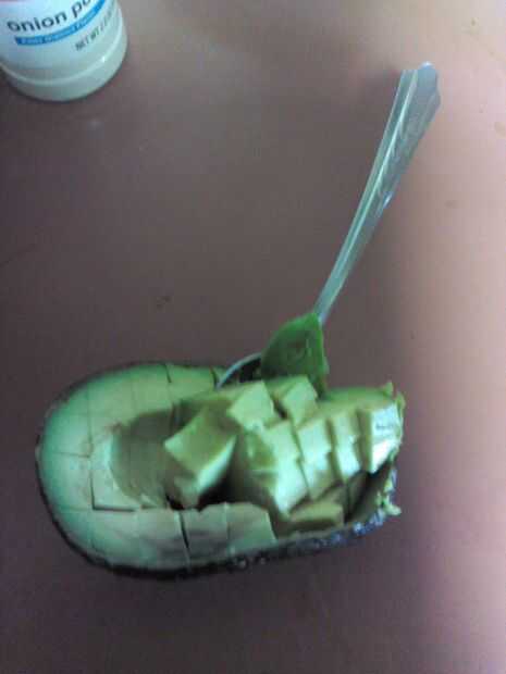 Utilice una cuchara para sacar el aguacate en un recipiente.