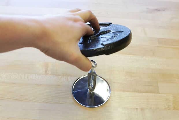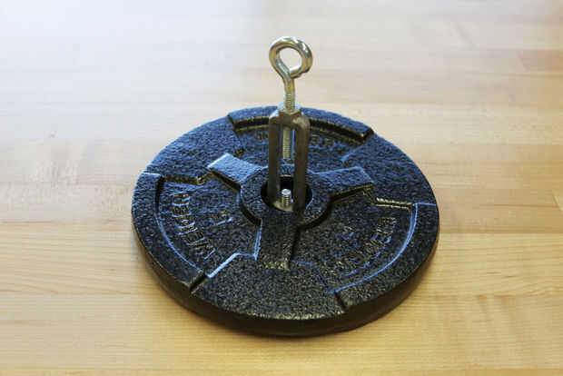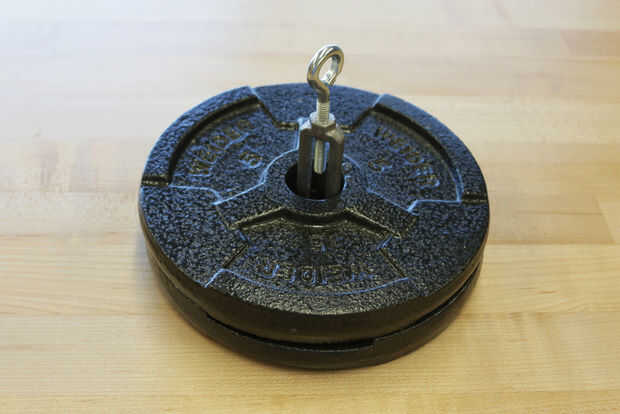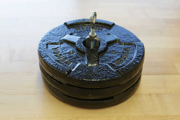 Perfectamente pila tres pesos encima de la placa de cubierta que el gancho del tensor es protroduing el agujero del centro.