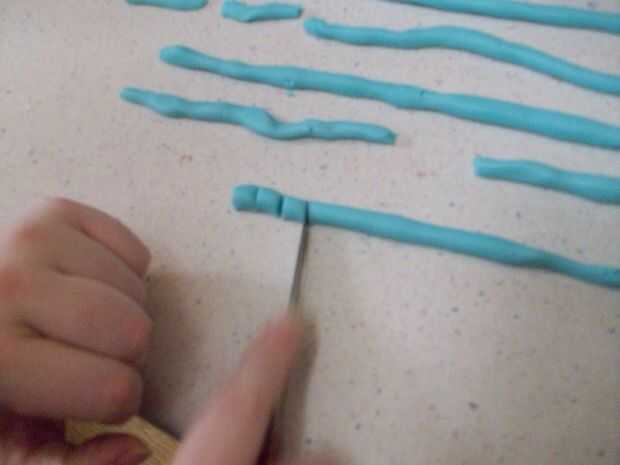 Nuestra masa no era rígido cortar con tijeras de manera que sólo la cortamos con un cuchillo de hielo, pero realmente puede usar cualquier cuchillo (sé que no cada uno tiene un cuchillo de hielo)