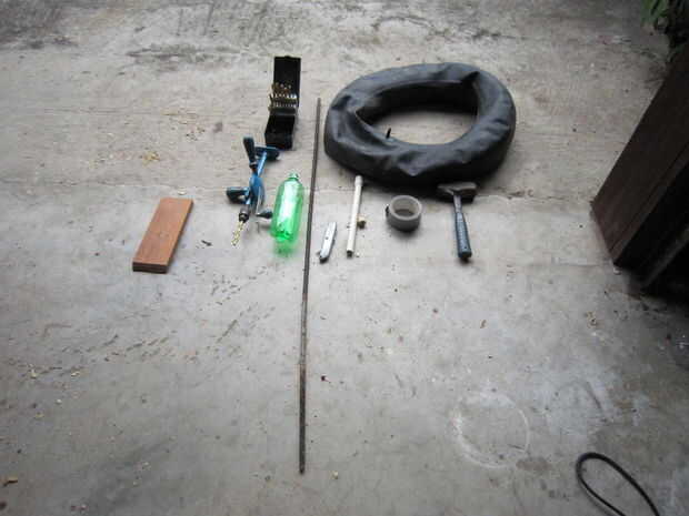 aquí es un cohete fácil diez minutos. Mi hermano y yo tenemos mucha diversión haciendo esto. Se utilizó un un tubo interno, taladro, brocas, una barra, cinta adhesiva, una botella de refresco de plástico, madera, martillo de metal, tubo de pvc y un cuchillo.