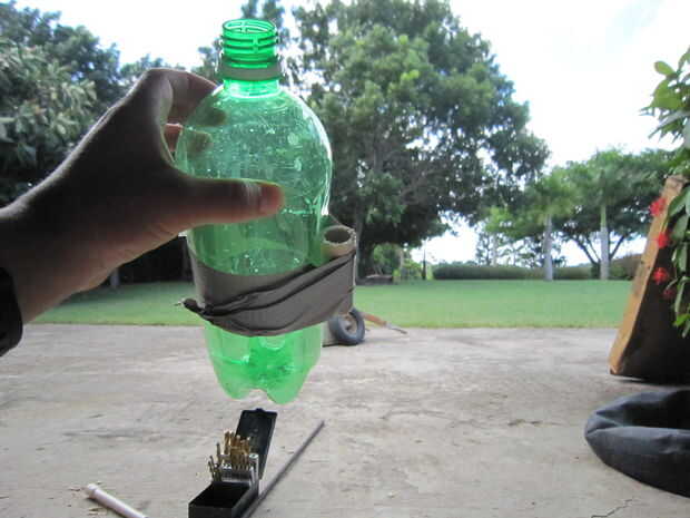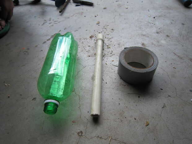 Conseguir una botella de refresco de plástico, un pedazo corto de tubería de pvc y un rollo de cinta adhesiva.