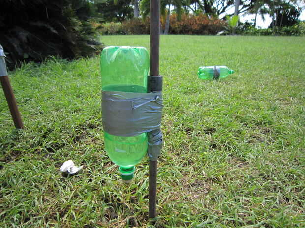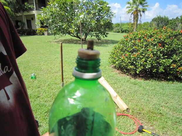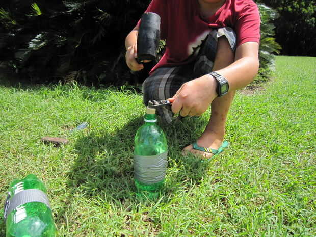 Tomar el mazo de goma y toque el enchufe como en la imagen de abajo.  Deslice la botella a la tubería.