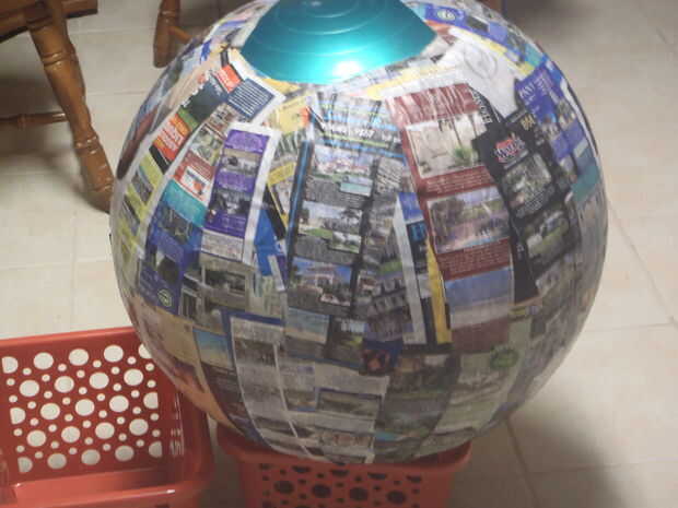 Luego las tiras de la bola de la capa, hacer cinco capas para hacer que el cuerpo estable y gruesa. Turnaban haciendo una capa de periódico y luego una revista. Dejé la parte superior descubierta y la parte inferior descubierto donde la cabeza se puede ir a través de la parte superior y la inferior por lo que pueden poner en la cabeza allí. Simplemente no deja demasiado al descubierto en la parte superior como lo hice, porque entonces usted tendrá que hacer un paso extra más tarde :) Deje que la bola se seque durante tres días en el sol. Entonces una vez que completamente se seca poco a poco sacando la bola hacia fuera de la parte superior pin o pueden aparecer demasiado si no importa el arruinamiento de la bola y luego lo saca del agujero inferior.
