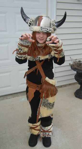 Bueno, como se puede ver, se ve increíble y fue realmente muy fácil de hacer. La base del casco es mi recipiente de cocina de acero. He utilizado el tamaño que más caben la cabeza de mi hija. Añadido algunos cuernos de vaca pulido que fueron comprados en línea, una segunda tienda abrigo de cuero y algunos piel falsa. Que es él y lo mejor: no tengo que coser una puntada.
