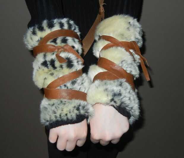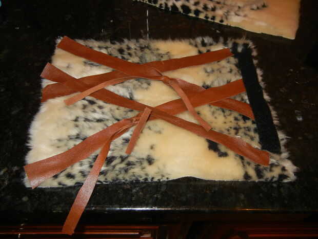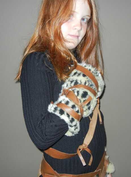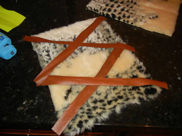 Simplemente atravesado algunos cuero tiras para hacer estas bandas de brazo y pierna. Usé Velcro para sujetarlos, pero para un cierre más seguro debo haber usado lazos de cuero. Funcionaba bien pegado el Velcro y no se cae, pero también era sensible en las fotos.