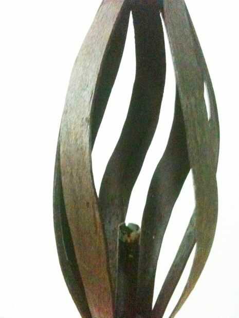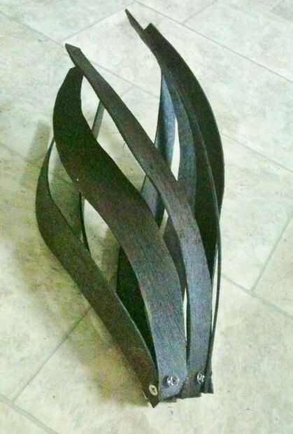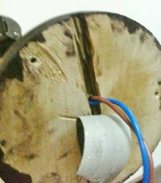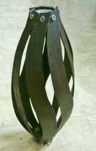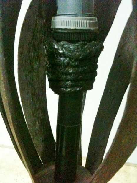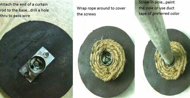 Cortar un círculo y me adjunta al final de un accesorio de varilla de cortina a él. Perfore un agujero a través de pasar el cable. Entonces para cubrir el accesorio... Envuelto en cuerda... la encolado y pintura negra o dejarlo así.