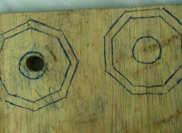 Cortar 2 bases en forma de octágono como la plantilla... luego perforar un agujero más grande en uno para pasar el tubo. lo mancha.