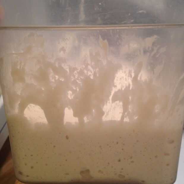 (es decir, si tu receta pide 1 taza de arranque, añadir harina 4 onzas y 4 onzas de agua. Si usted necesita una 1 1/2 taza, añadir agua de 6oz y 6 oz de harina. Cuando el motor de arranque las burbujas y se levanta, está listo para usar y retirar la cantidad que necesita. El motor de arranque que es sobrante debe alimentado y la izquierda en sala temp. unas horas antes de regresar a la nevera).