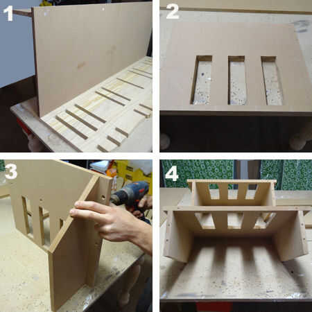 2. use su rompecabezas para recortar las aberturas de ambos brazos [B]. Use un Dremel MultiMax o mano arena para quitar cualquier borde desigual. En el apoyabrazos lados [F] la medida 150 mm desde la parte inferior, dibuja una línea y cortan diagonal.