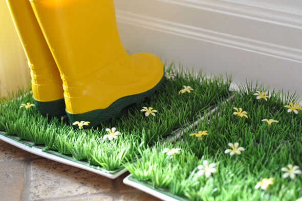 subió con este DIY instantánea adorable y rápida para agregar un toque de primavera a su puerta.  Descubrí los azulejos imitación hierba en mi tienda local de dólar y placas cuadradas que eran del mismo tamaño.  Puse dos baldosas de césped en 2 placas cuadradas y voilà - bandeja de arranque instantáneo!  Este mini proyecto gana por un costo de $6 y menos de 1 minuto para formar del total, en todos los niveles.