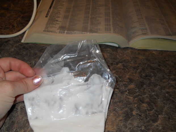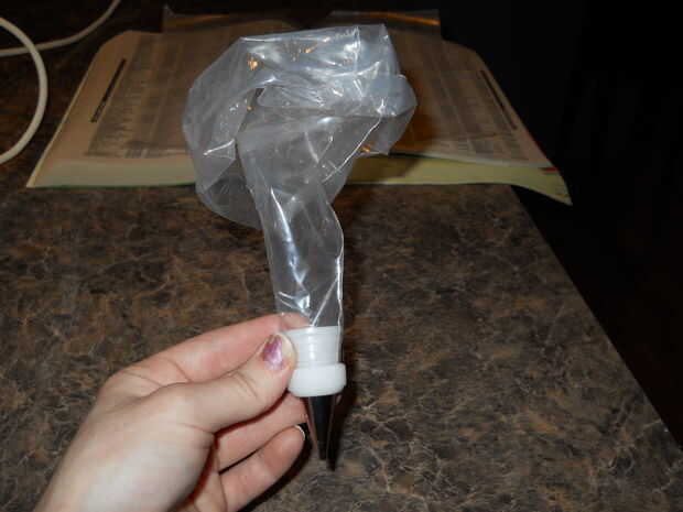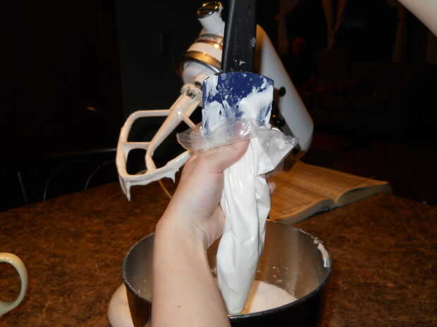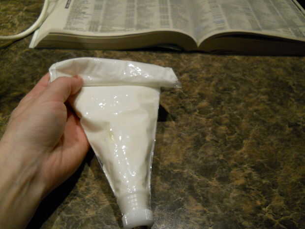 Con la espátula de goma, cuchara del blanco real formación de hielo en la bolsa - No llene la bolsa todo el camino a la cima. Deje por lo menos una pulgada y media. Ahora dobla las dos esquinas y rodillo el borde hasta llegar a la formación de hielo. Al usar el glaseado mantenga rodar el borde abajo - esto le ayudará a mantener presión agradable y estable y hace menos de un lío!