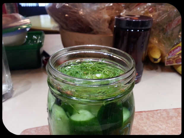 Coloque las especias de conserva en vinagre, mitad eneldo y un ajo diente en el fondo del tarro de masón. Agregar salmuera pepinos, luego la salmuera hasta que se cubran los encurtidos. Rellene el eneldo restante y el ajo abajo entre los pepinos. No deje el flotador eneldo o ajo encima de la salmuera, ya que esto puede promover el crecimiento de moho.