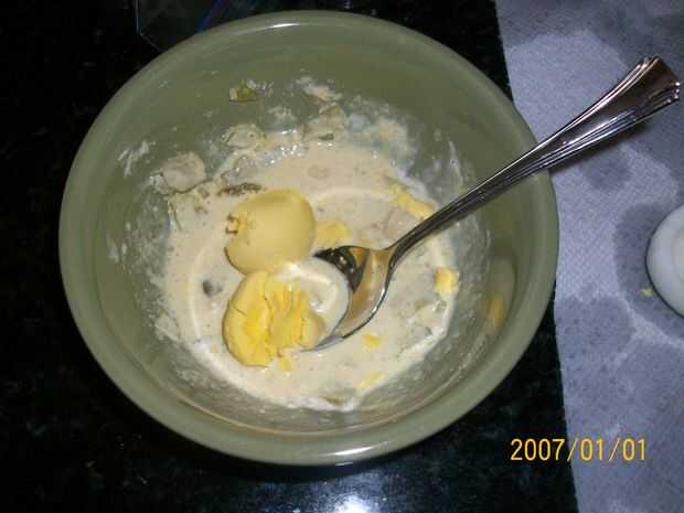 sobrevivir la tierra baldía o usar todos esos huevos duros de semana Santa, su opción!  En Fallout 3 y Fallout: New Vegas. Por suerte esta versión no es irradiada.12 huevos1/2 taza de mayonesa2 cucharadas de leche1 cucharadita de perejil1 cebolla ver