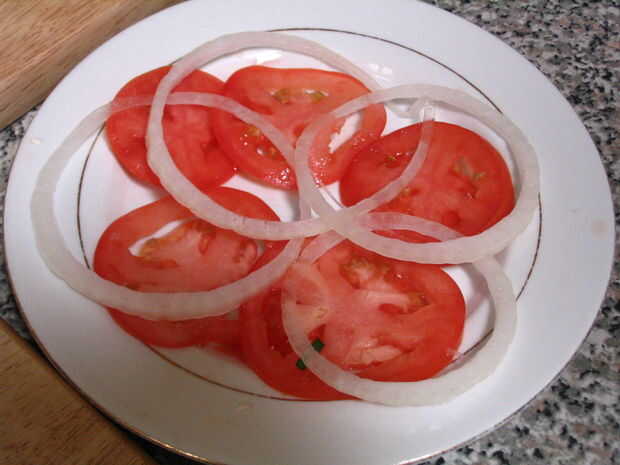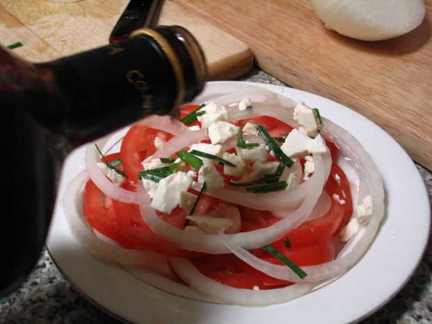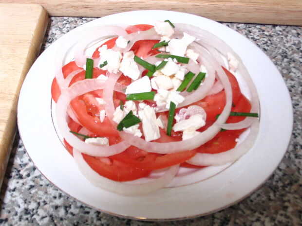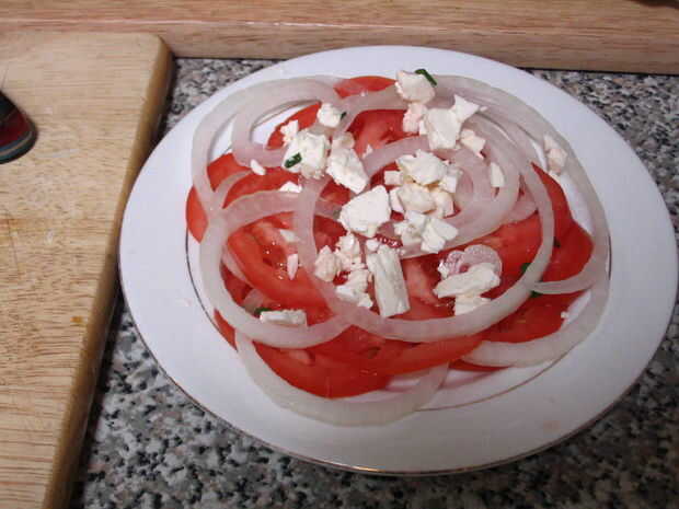 Alternado, capas de rodajas de tomate y cebolla en un plato de ensalada. Espolvoree el queso feta desmenuzado por encima de la cebolla y los tomates. A continuación, agregue las hierbas picadas. Rociar aceite de oliva y vinagre en la ensalada. Sazonar con pimienta negra recién molida, sal al gusto.