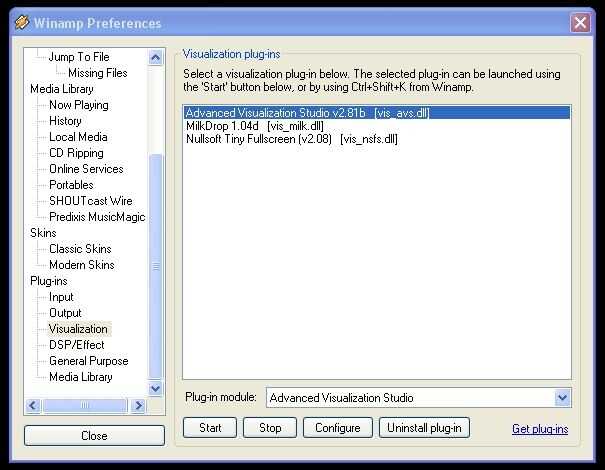 Se abrirá la ventana "Winamp Preferences". Hay larga lista de elementos en la parte izquierda, desplácese hacia abajo hasta encontrar la "Visualización" y haga clic en él. El lado derecho de esta ventana se debe tener entonces "Estudio de visualización avanzado vX.XX (vis_avs.dll)" aparece, clic izquierdo sobre el que poner de relieve como se muestra en la foto, luego presione el botón de "Inicio" seguido por la izquierda clic en el botón "Configurar".
