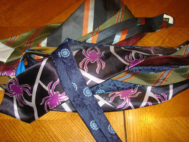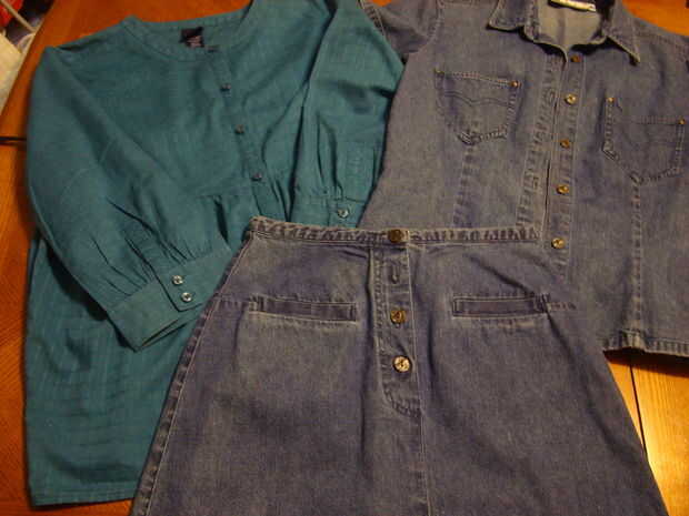 usaba notaciones básicas de costura y una máquina de coser. Cosí a mano algunas cosas porque mi máquina no cose algunas cosas. Usé jeans viejos, un vestido formal, una camisa, tela vieja de los 80, un vestido, corbatas, tubos, broches y botones antiguos.
