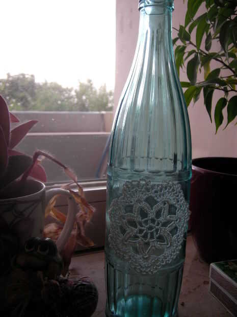 Encontré una hermosa botella azul en el mensa (que vendieron agua mineral), limpiar (para conseguir el papel fácilmente o mantener en agua caliente con detergente líquido durante la noche o poner en el lavavajillas) y luego pega el encaje que. He utilizado pasta de papel pintado, pero supongo que cualquier otro pegamento fuerte funcionaría así.