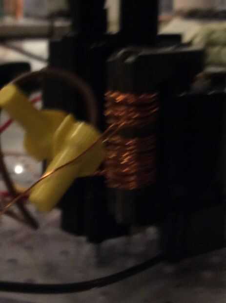 Con algún alambre del imán, primaria (15ish envuelve) y secundario (10ish envuelve) alrededor del núcleo de ferrita del transformador en la misma dirección del viento. Entonces Pele el aislamiento del extremo del cable más grande saliendo de la parte superior del transformador. Este es el alto voltaje hacia fuera.