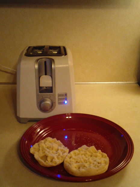 Rebanadas de tostadas de mollete inglés en tostadora en medio hasta un poco crujiente (1-2 mins. máximo). Esto reduce el tiempo de cocción y asegura pizzas crujientes.