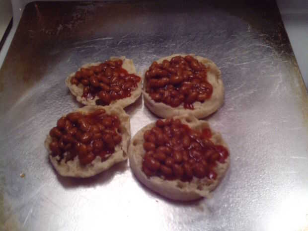 Charola rociado con aerosol de cocina antiadherente. Colocar 4 muffins grieta lado hacia arriba en hornear unas pocas pulgadas aparte. Colocar unas cucharadas de alubias sobre cada rebanada de muffin.