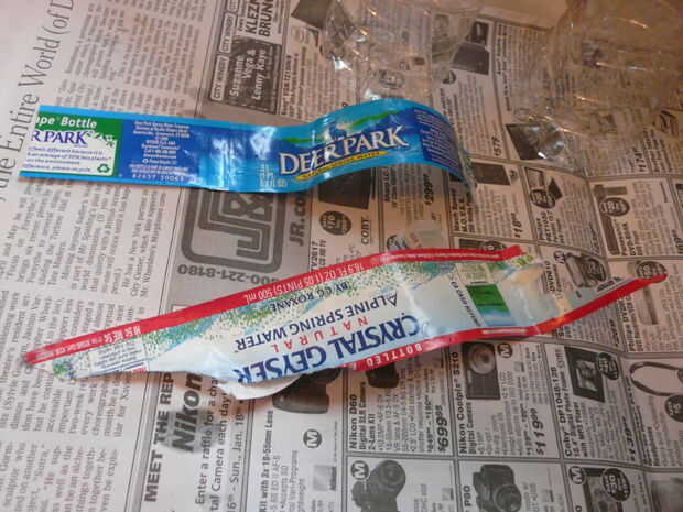 Este es un buen momento para encender la pistola de pegamento caliente, si no lo has hecho ya. Este paso será más fácil con etiquetas de plástico. Es el mismo proceso con las etiquetas de papel, pero requieren más raspado y extracción. En primer lugar, correr agua caliente en las botellas para ablandar el pegamento. Luego hacer un corte al lado del adhesivo y desprenda la etiqueta. Probablemente quedará algún adhesivo. Ojalá pudiera ayudarte con él pero no pude conseguir mina, ni con una espátula caliente y grasa de codo, que resuelve generalmente la mayoría de mis problemas persistentes de adhesivo.