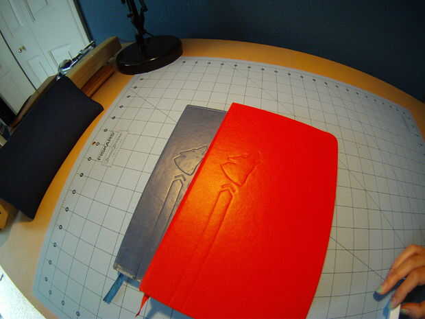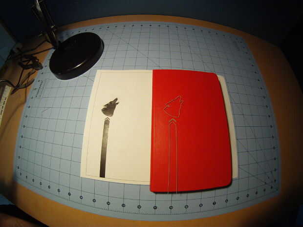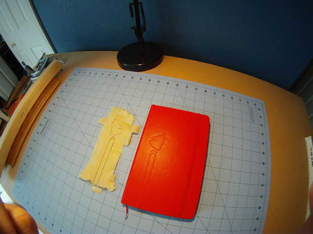 Coloque el sello en el portátil para la grabación en relieve. Utilice cinta adhesiva para mantener el sello en su lugar. Sólo unos trozos de cinta se necesitan para una prensa. Tuve 3 piezas separadas así que había reforzado mi sello con más cinta adhesiva. Con cinta de enmascarar más que realmente puede pelar apagado el material de una cubierta suave, que me enteré de la manera dura (ver el cuaderno azul en la imagen siguiente). Pero mi notebook cubierta semidura (rojo) maneja la eliminación de la reforzada cinta adhesiva fina.