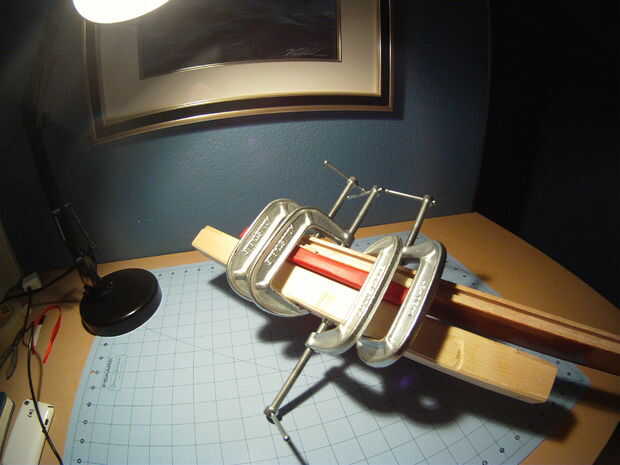Ahora es el momento para el apretón! Tengo 4 abrazaderas de 'C' práctico y un 1 x 1 y un listón de piso de madera.