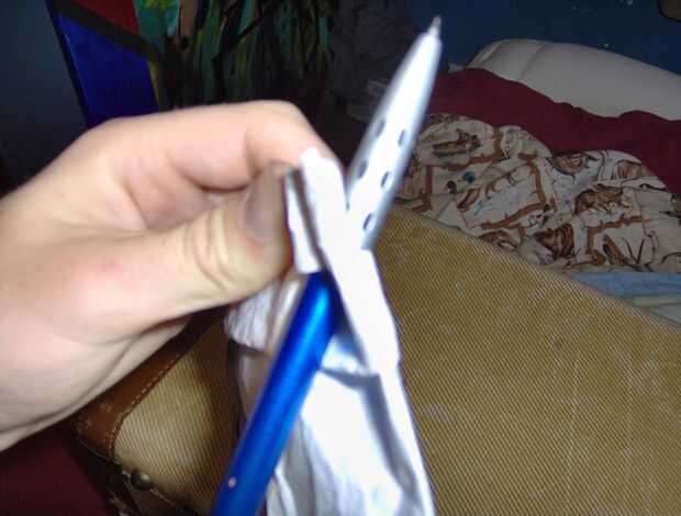 Se necesita hacer un lugar para la correa conectar a. Para comenzar plegable de aprox. 1 de la parte superior y luego doblar de nuevo (foto uno). Después, pónganla en el borde y corte una raja para hacer un agujero para la correa (dos de pic y tres). (el la pluma es que ilustrar Dónde está el agujero)