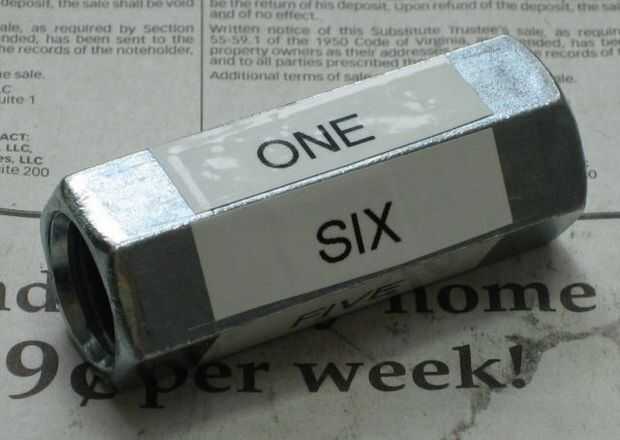Si no tienes una máquina de etiqueta - no te desesperes! Simplemente Mida la altura de los pisos en la tuerca de acoplamiento e imprima su básica uno, dos... en tu ordenador. Podría mano escriba en papelitos. Cortar el papel por lo que son en tiras, de aproximadamente 1/8" de más corto que la parte plana de la tuerca de acoplamiento y por lo menos 1/4" de más corto que la longitud de la tuerca de acoplamiento.