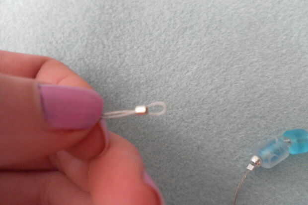 empuje un grano prensado a lo largo de su cable hasta el final dejando un pequeño lazo esto es eran ataremos el clasp.use usted pinzas cierre del talón apretado