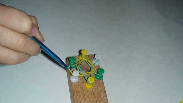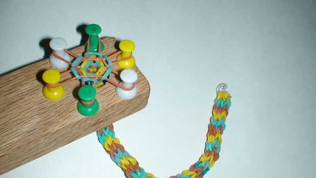 We started with yellow. Ponemos la primera banda en forma de triángulo apuntando hacia arriba, con tres de los pernos. Luego coloque la segunda banda del mismo color, en un triángulo apuntando hacia abajo. Después de eso, colocamos azul encima del amarillo, usando el mismo patrón. Voltea el amarillo sobre el azul. A continuación coloca el marrón en el mismo patrón y volcó el marrón con el azul. Continuar haciendo esto hasta que usted utilice sus bandas o ha alcanzado la longitud deseada.