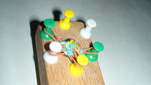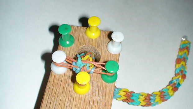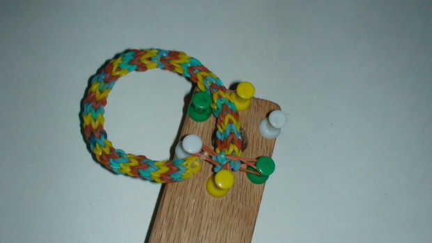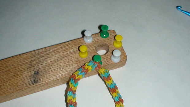 por favor como y seguir!!!!!! Asegúrese de que el telar se parece a las fotos!Paso 1: materiales Se necesita:Un telarUn gancho deBandas del arco irisClips dePaso 2: Comenzar con un telar En el telar, lugar de su primera banda de caucho diagonalmente